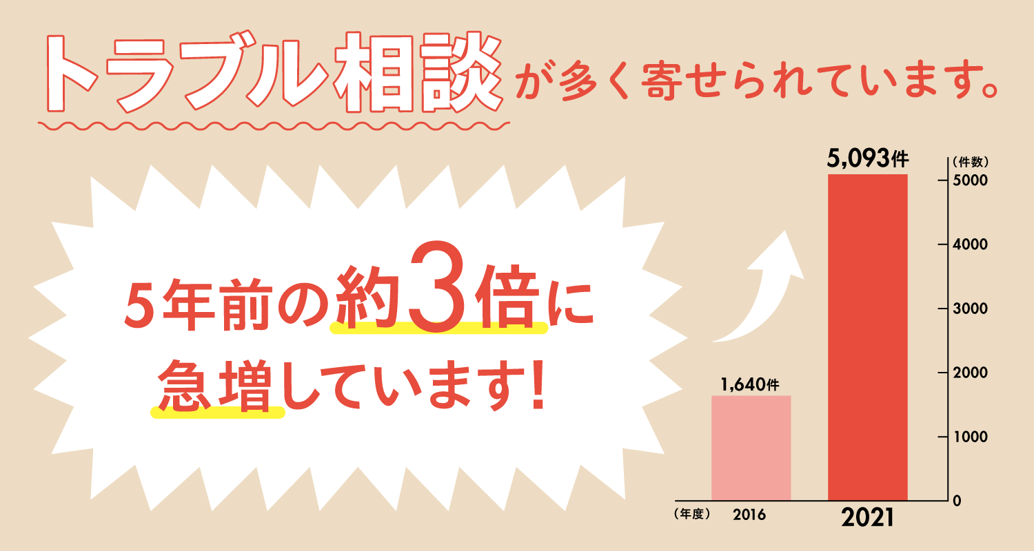 悪質な業者による火災保険のトラブルは、年々増えています。グラフのとおり、2021年は2016年に比べて約3倍に増えています。この数字はあくまでもトラブル相談の件数なので、実際の被害はもっとある可能性もあるのです。